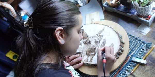 Finally, I changed my name to Autumn in August and everything fell back into place. I picked up burning again and remembered how much I loved it. The smell, the way the pen would glide across the piece, and the patience it took to create something. It finally clicked, that I found my thing, my niche. So I invested in a high quality wood burner and a ton of wood slabs and got to work creating things. I started off simple and safe, making cute home décor until I got my first custom request in 2019 for a project I'd never attempted before. The customer loved it! It was after that, that I finally realized I was playing it safe this whole time. I began perfecting my pieces and challenging myself - taking on designs that required more detail and patience. I started getting requests for dog portraits and absolutely fell in love with it. I was a dog handler, in doggy daycare and boarding facilities for 7 years prior to goin back to school and doing dog portraits helped me feel like I was still connected to that life.